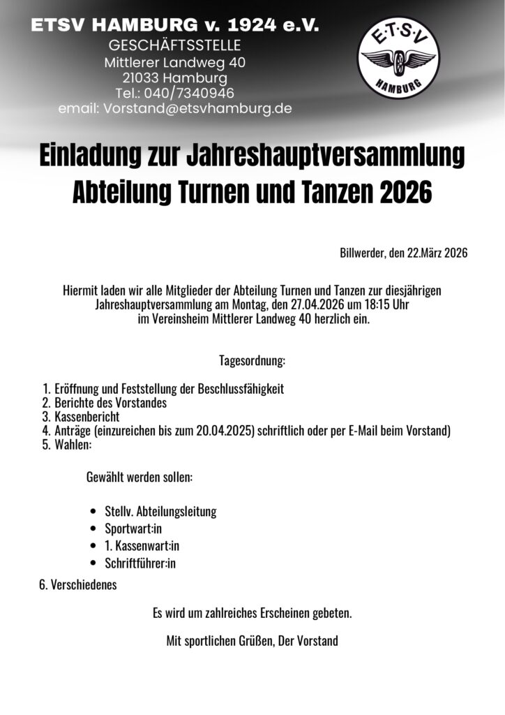 Allgemein JHV Turnen und Tanzen Mirco Meizel 24 März, 2026 Continue Reading Previous: Jugendhauptversammlung 2026 Related Stories Allgemein Jugendhauptversammlung 2026 Mirco Meizel 20 Februar, 2026 Allgemein Nachwuchs gesucht Mirco Meizel 19 Februar, 2026 Allgemein Billwärder Turnverein jetzt im ETSV Mirco Meizel 16 Februar, 2026
